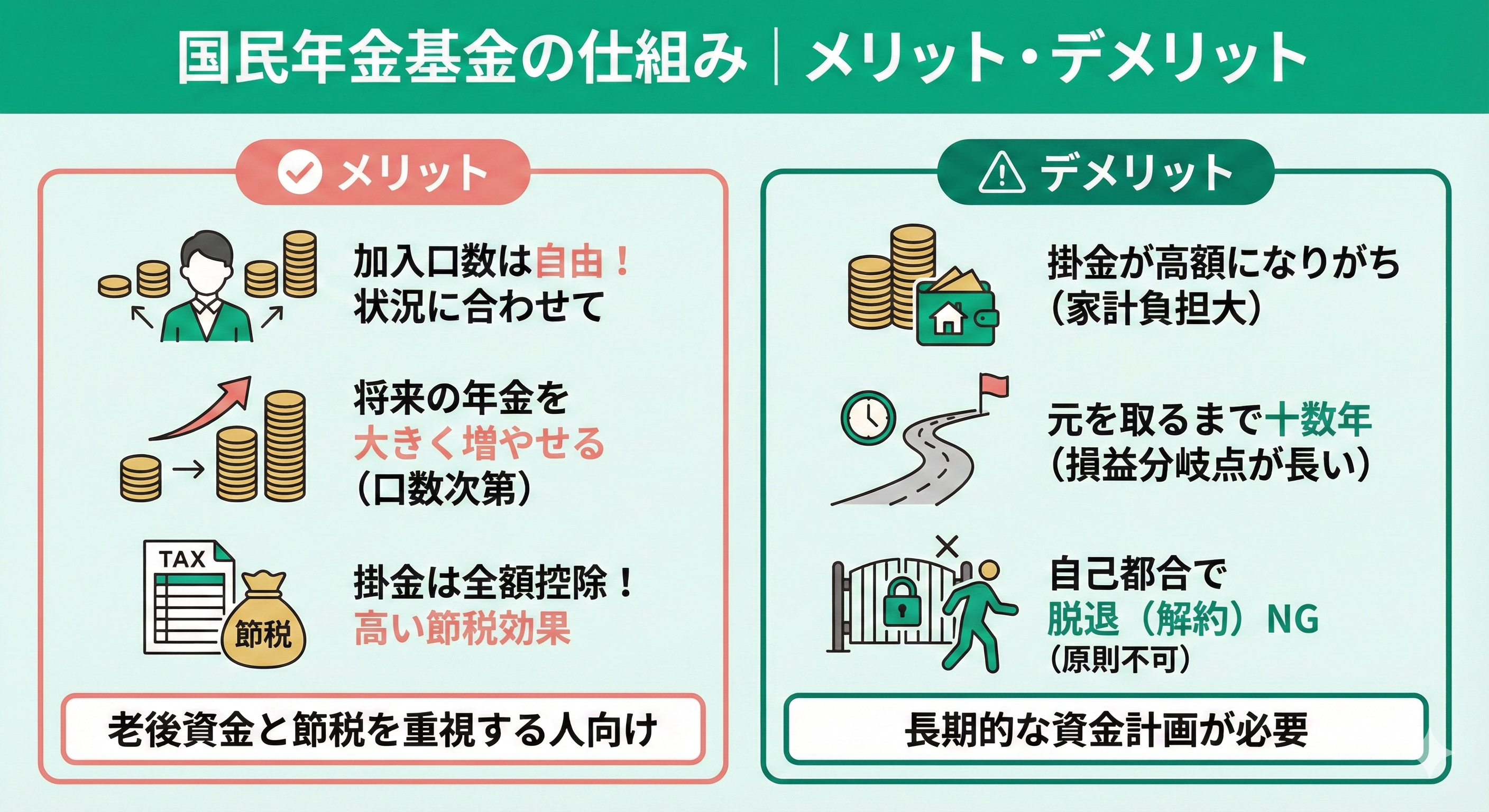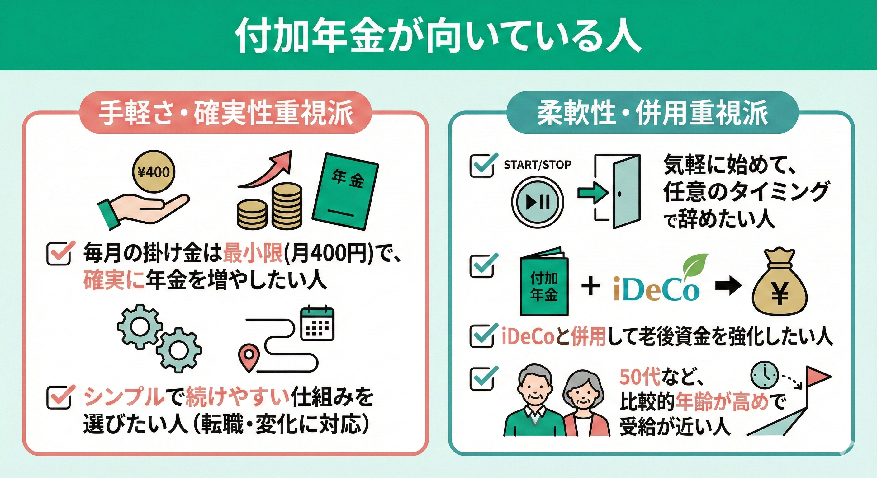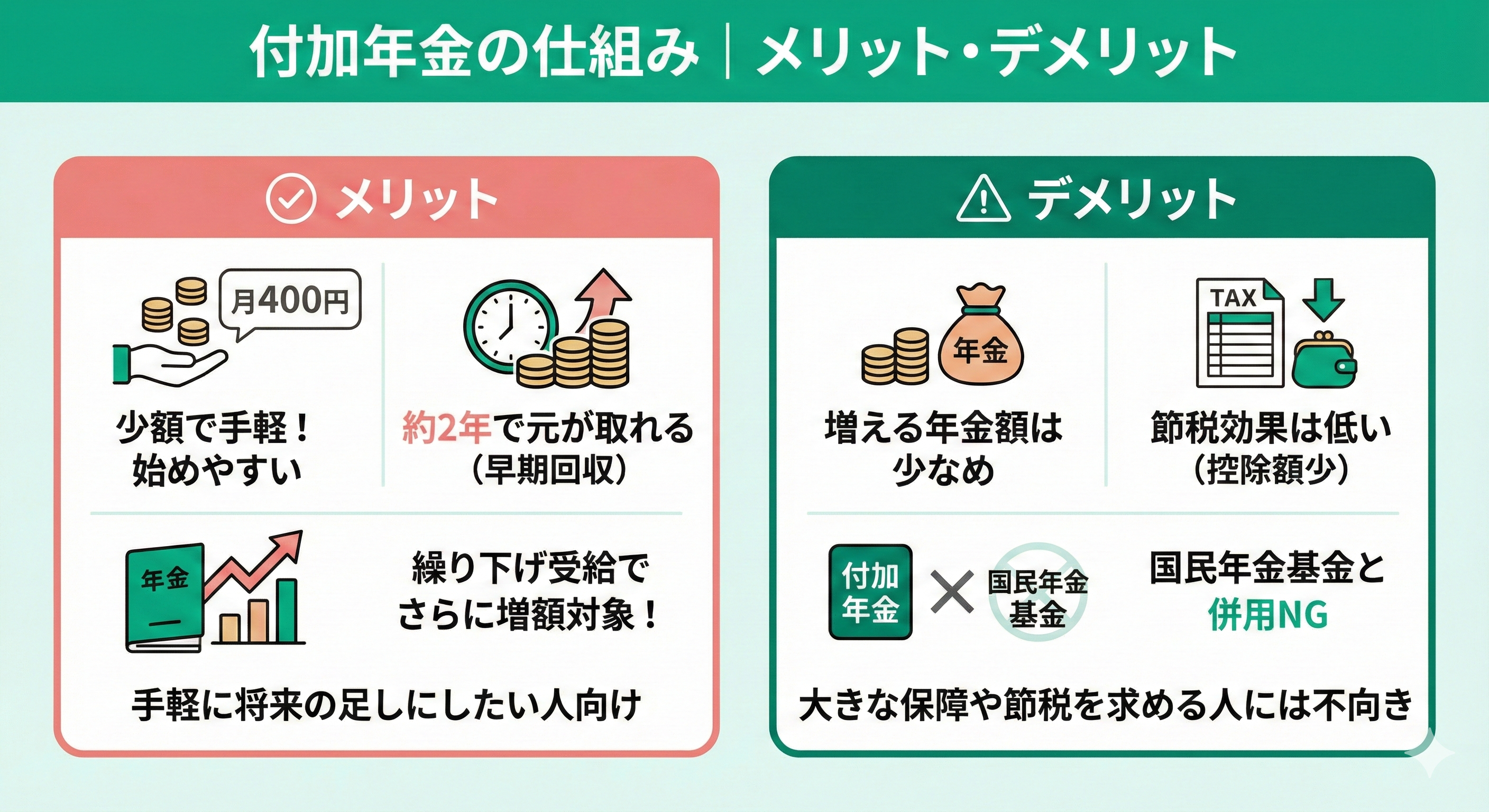 ここでは、付加年金と国民年金基金それぞれのメリット・デメリットを整理、iDeCoと併用する際の注意点を紹介します。
