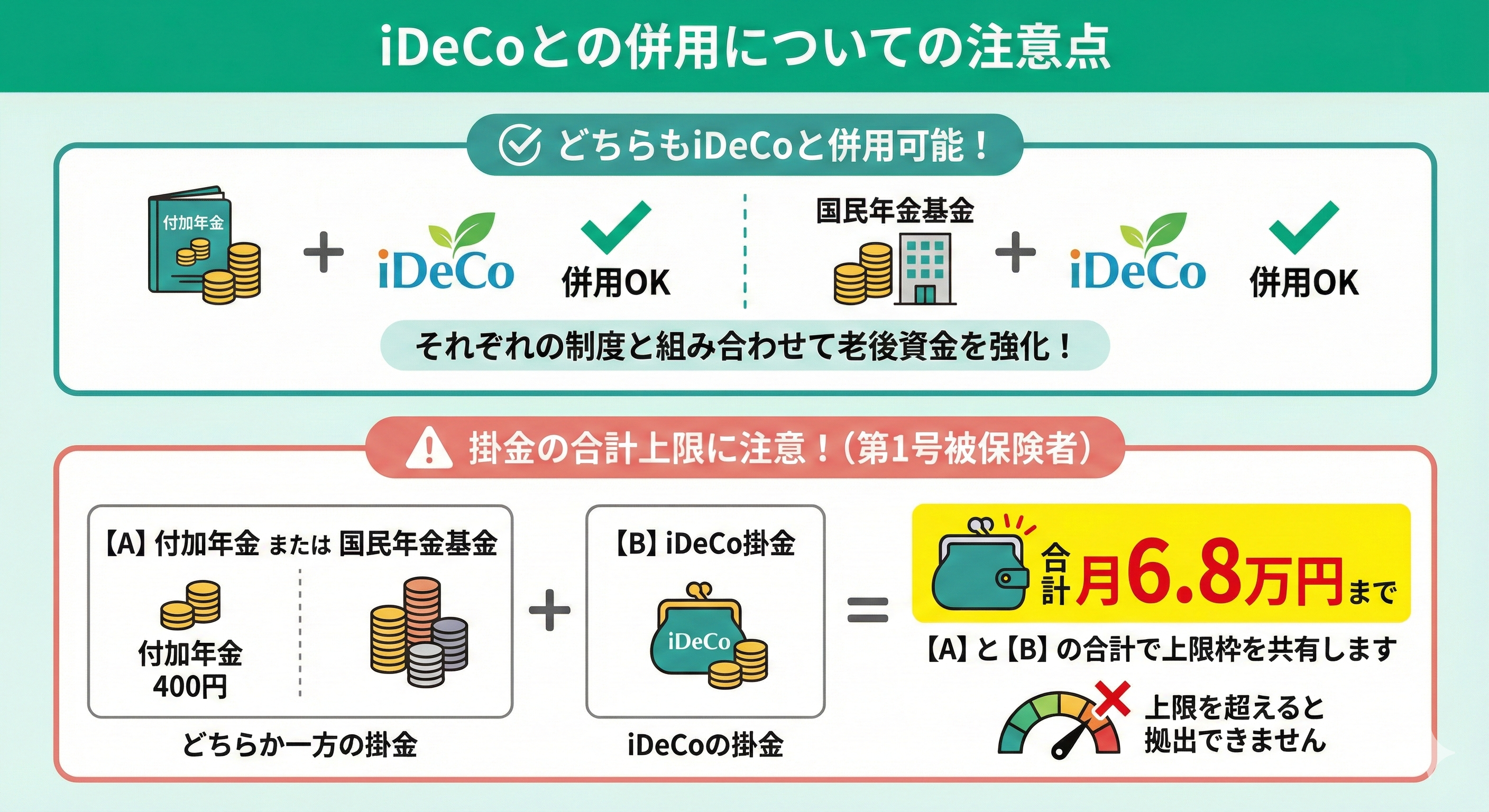 付加年金と国民年金基金は併用できませんが、いずれもiDeCo(個人型確定拠出年金)と併用することは可能です。
