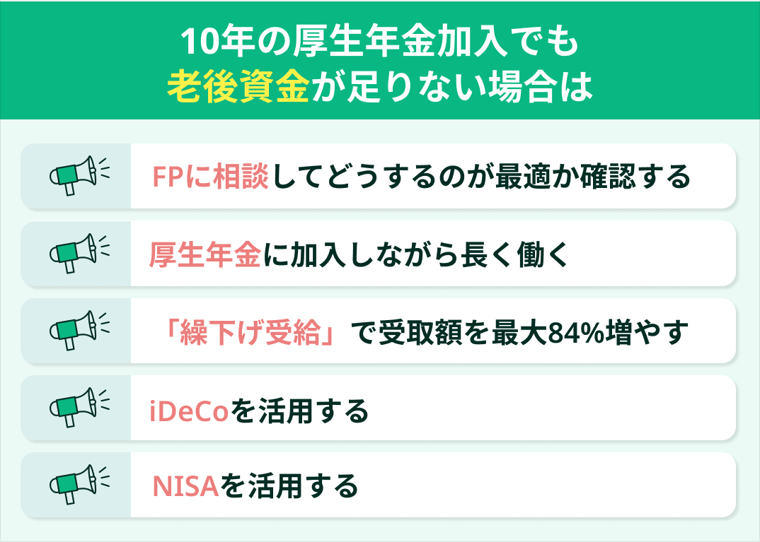 - 10年の厚生年金加入でも老後資金が足りない場合は