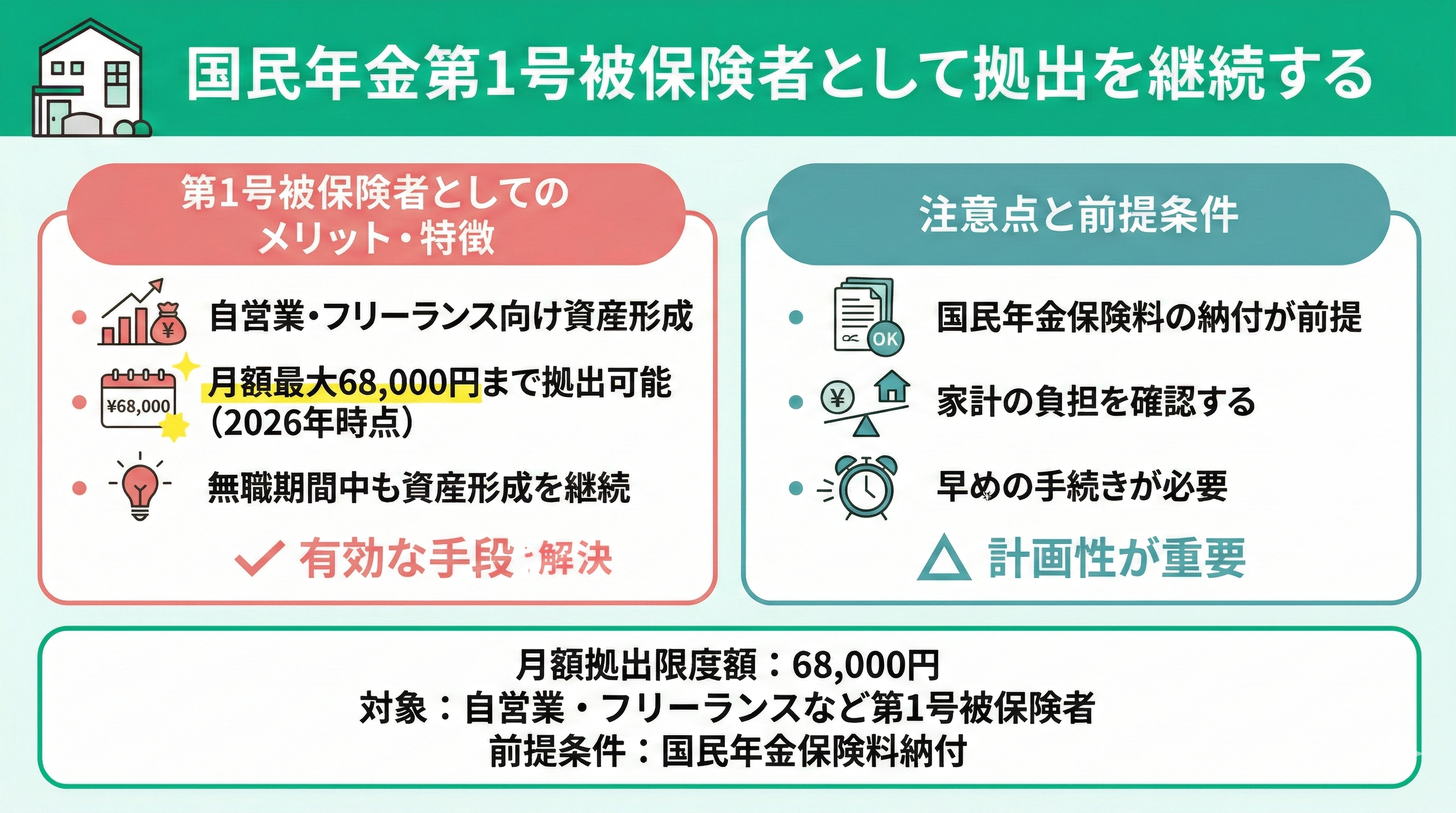 一方で、将来的な積立効果や節税効果を維持したい方は、国民年金第1号被保険者として拠出を継続することができます。