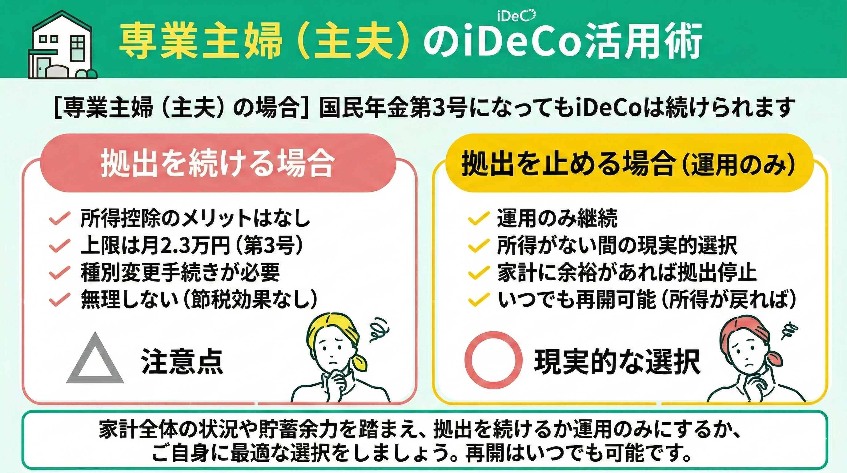 専業主婦(主夫)となり国民年金第3号被保険者になった場合でも、iDeCoの拠出は継続可能(上限月2.3万円)です。