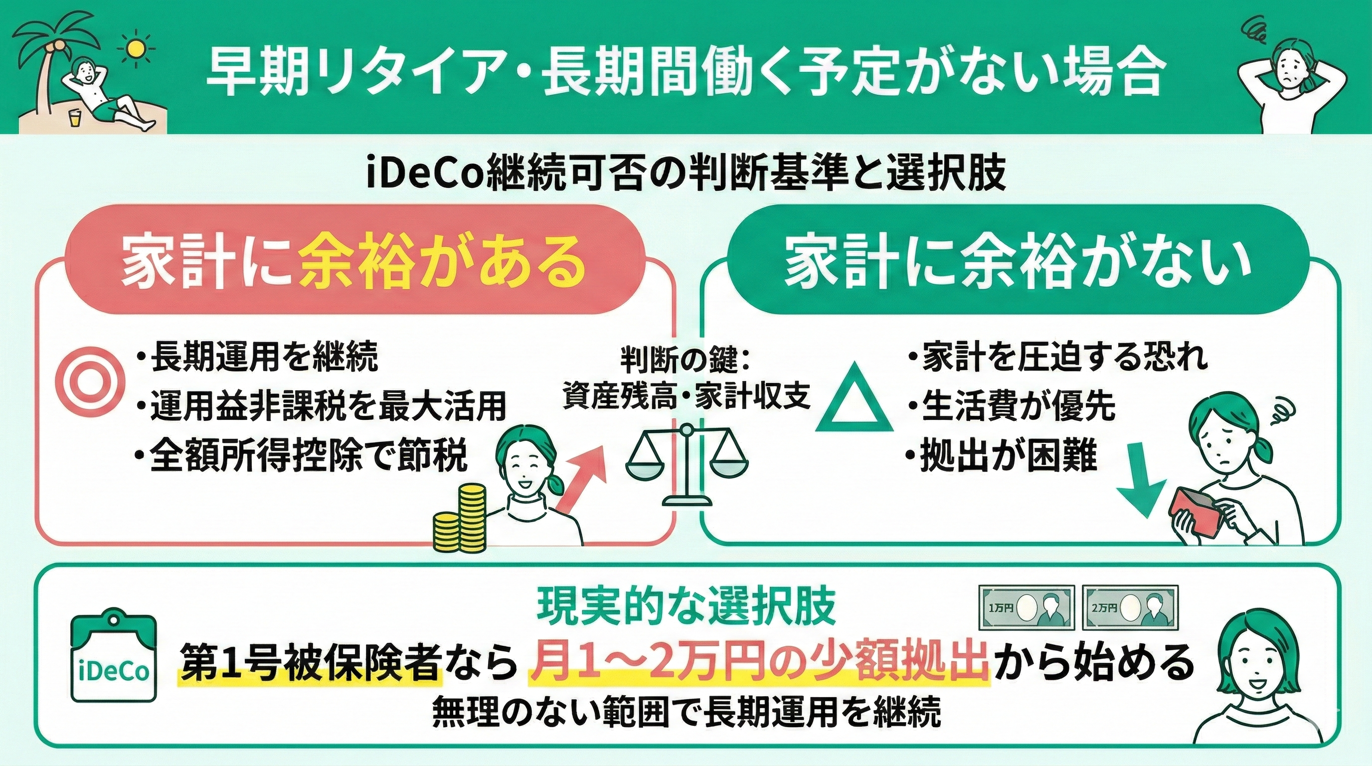 早期リタイアなどで今後の就労予定がない場合は、資産残高と家計収支を踏まえ、iDeCoの継続可否を慎重に判断しましょう。