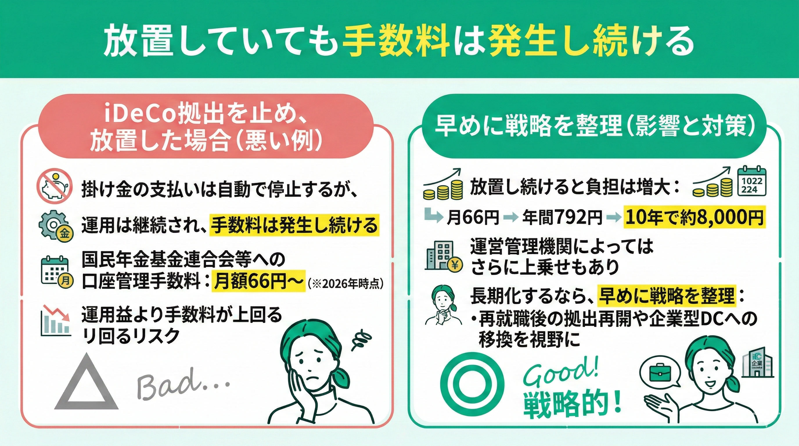 放置すると月額66円〜の管理手数料が発生します。また原則60歳まで引き出せません。生活資金に充てることはできないため、資金計画を踏まえた判断が重要です。