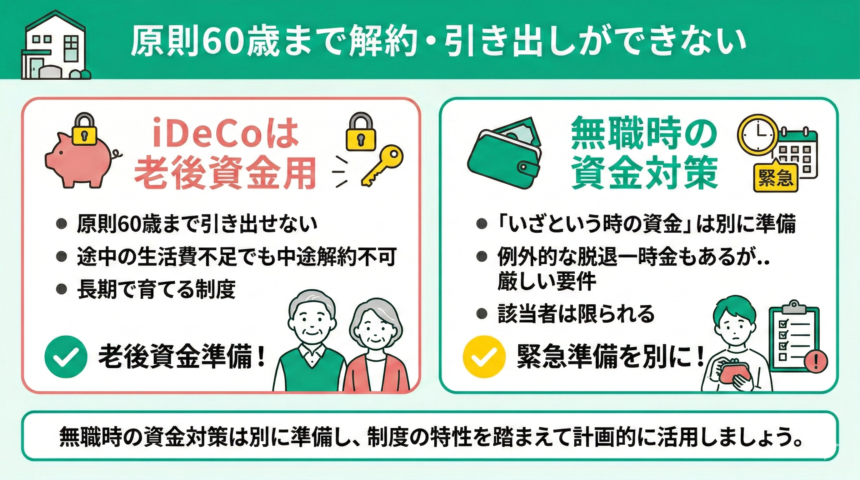 2つ目の注意点は、iDeCoは原則60歳まで引き出せない点です。途中で生活費が不足しても原則として中途解約はできません。