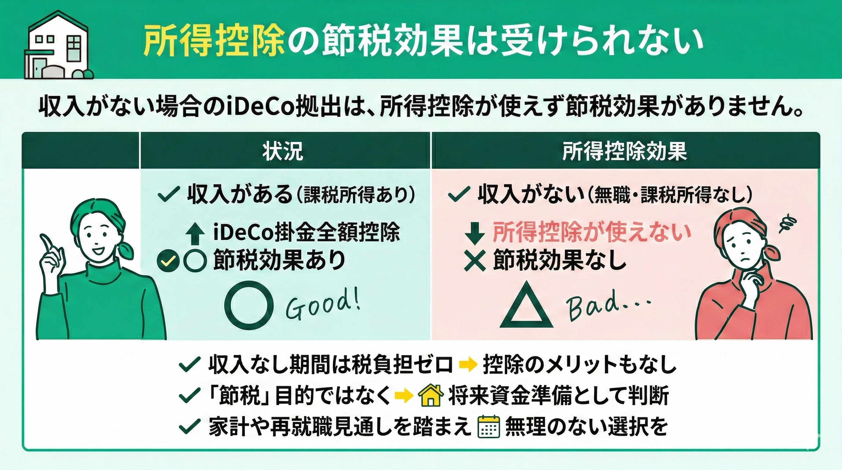 収入がない期間は税負担自体がないため、控除の恩恵も受けられないのです。したがって、この時期の拠出は「節税」ではなく、将来資金をどう準備するかという視点で判断することが大切です。家計状況や再就職の見通しを踏まえ、無理のない選択を心がけましょう。