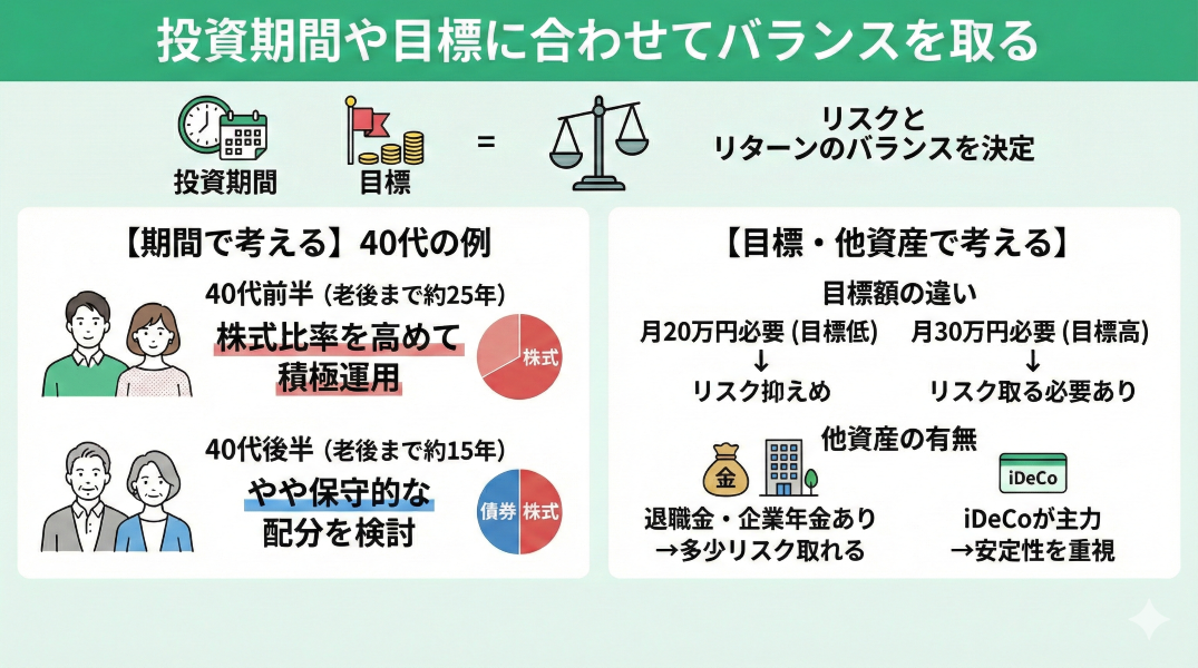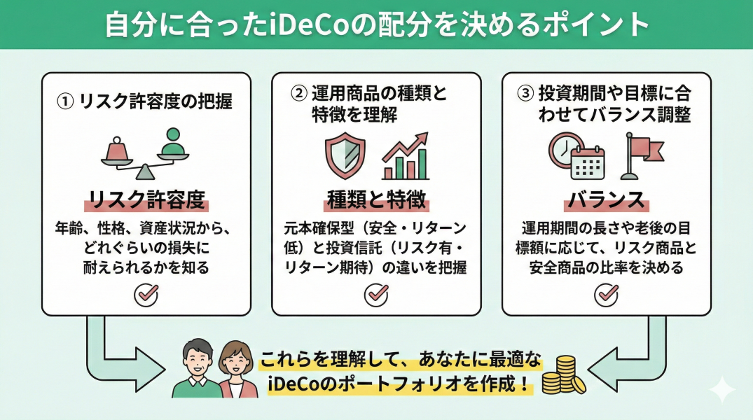 投資期間や目標に合わせてバランスを取ることが、成功するiDeCo運用の鍵となります。