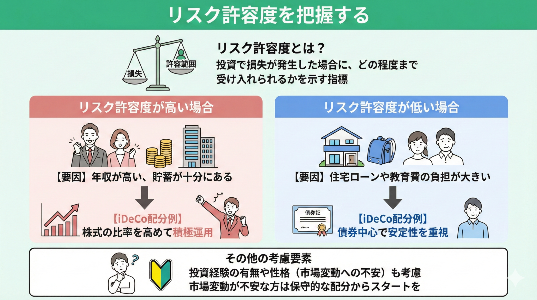 リスク許容度を把握することは、iDeCoの配分を決める上で重要なポイントです。