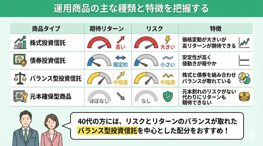 運用商品の主な種類と特徴を把握することで、適切な配分を決めることができます。