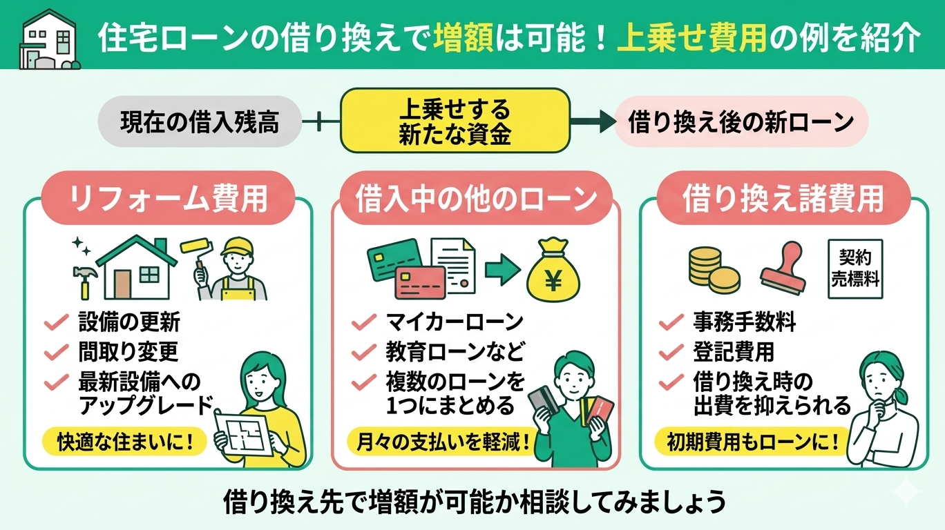 - 住宅ローンの借り換えで増額は可能!上乗せ費用の例を紹介