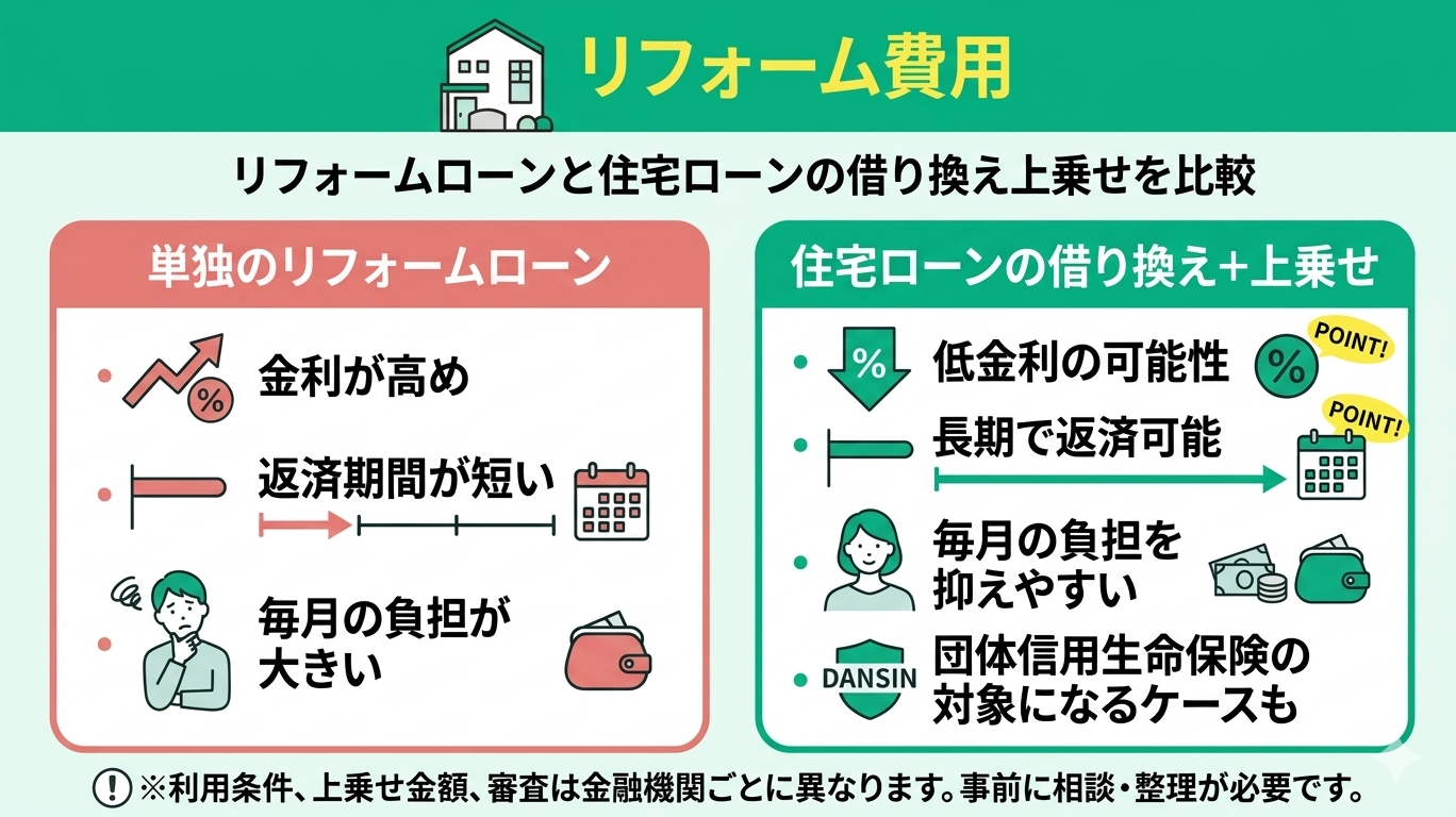 リフォーム費用を準備する際、リフォームローンを利用すると金利が高めで返済期間も短く、毎月の負担が大きくなる場合があります。その点、住宅ローンの借り換えと同時にリフォーム費用を上乗せできれば、低金利かつ長期で返済できる可能性があるため、資金計画を立てやすくなります。