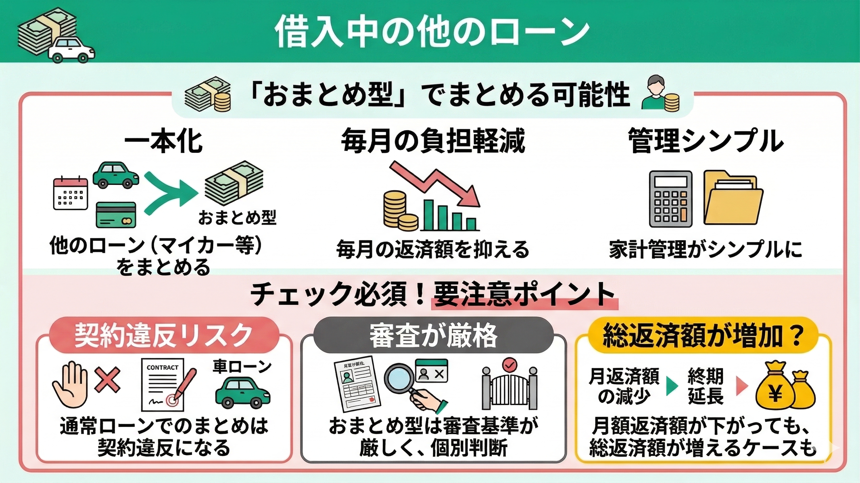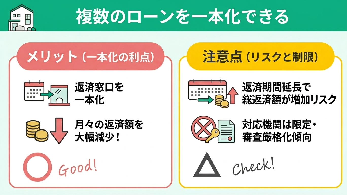 - 注意点:他のローンの返済期間が延びるため、最終的な総返済額が増えるリスクがある