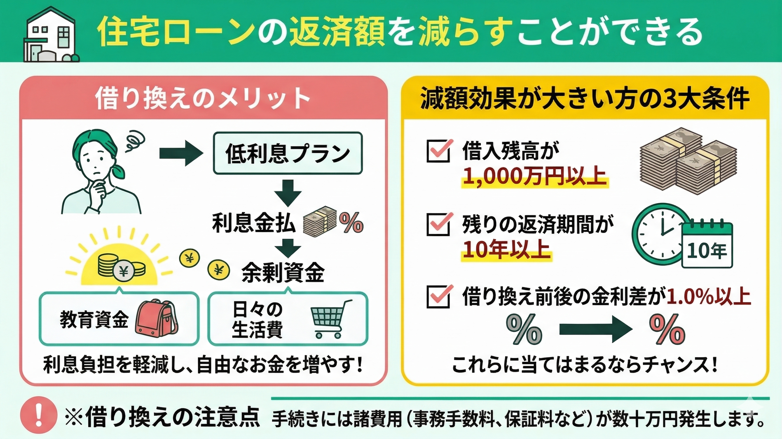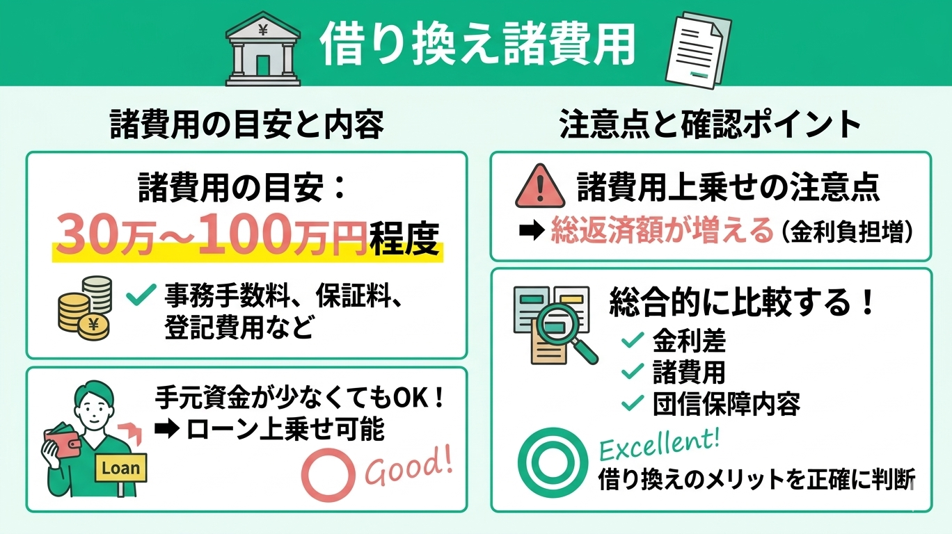 ただし、手続きには数十万円単位の諸費用(事務手数料や保証料など)が発生します。そのため、目先の月々の負担だけでなく、「諸費用を含めた総返済額」で比較し、本当に得をするか見極めることをおすすめします。