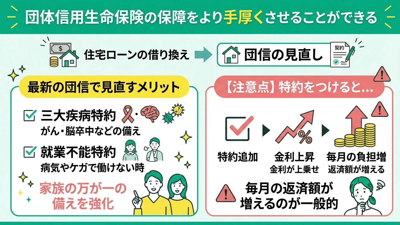 住宅ローン借り換えの隠れたメリットに、「団体信用生命保険(団信)」の保障内容の見直しがあります。
