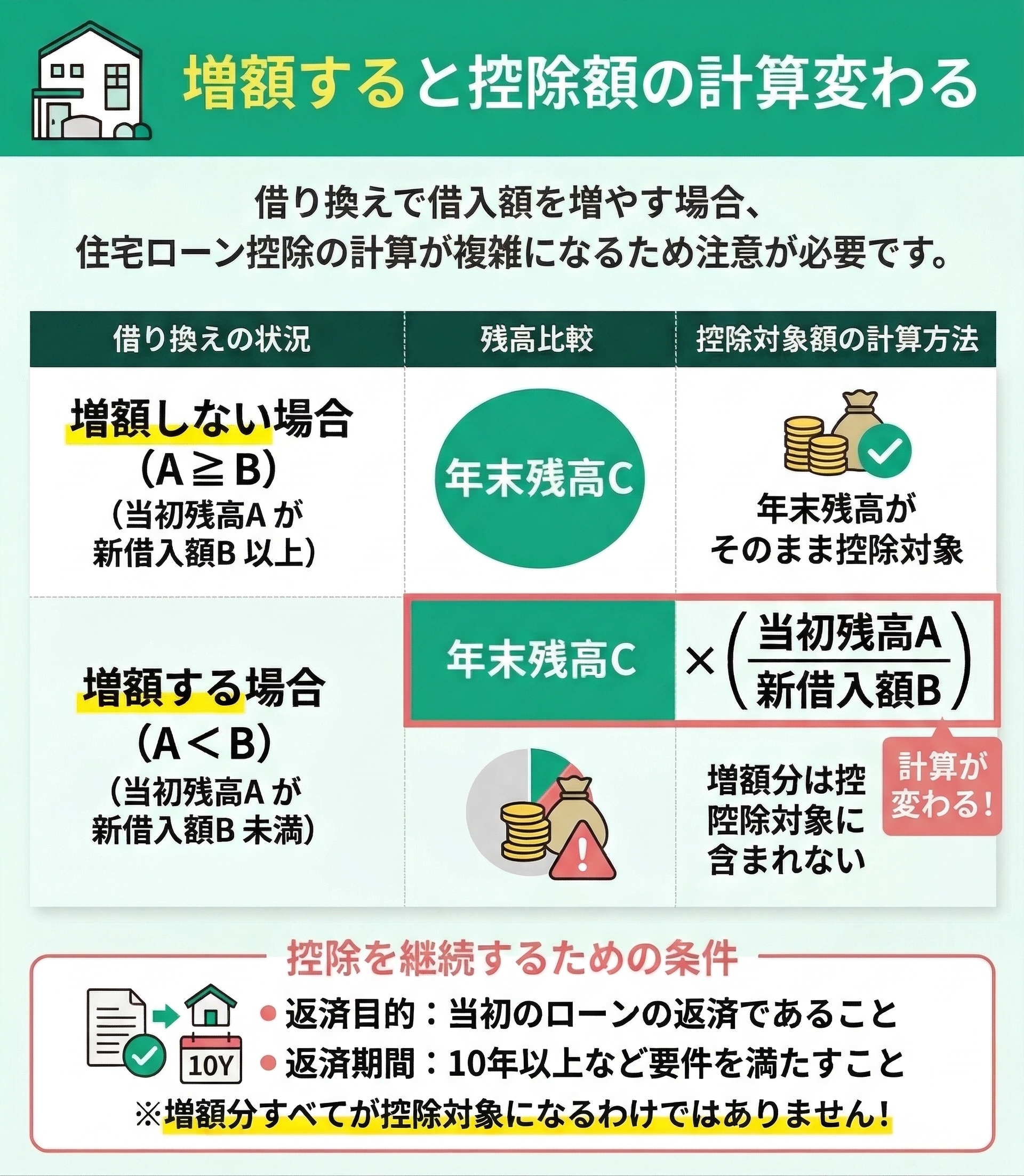 - A(借り換え前残高)≧B(新借入額)→控除対象=年末残高C